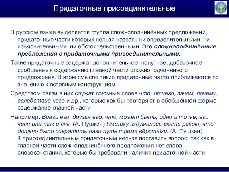 Такие придаточные содержат дополнительное, попутное, добавочное сообщение к содержанию главной части сложноподчинённого предложения. В этом смысле такие придаточные часто приближаются по значению к вставным конструкциям.