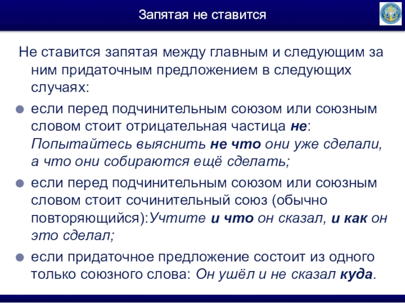 если перед подчинительным союзом или союзным словом стоит сочинительный союз (обычно повторяющийся):Учтите и что он сказал, и как он это сделал;