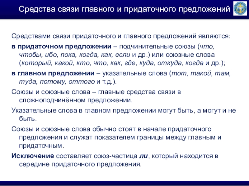 Союзы и союзные слова – главные средства связи в сложноподчинённом предложении.