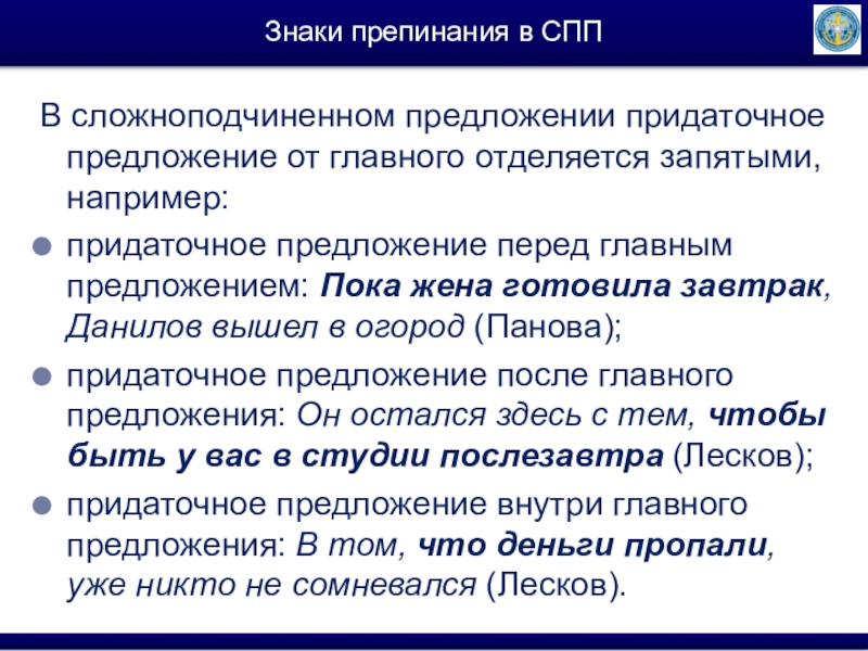 придаточное предложение внутри главного предложения: В том, что деньги пропали, уже никто не сомневался (Лесков).