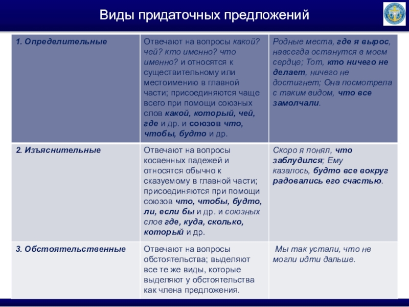как меняются смысловые отношения между главной и придаточной частями в зависимости от употреблённого подчинительного союза (или союзного слова). Установите, к какому виду относится каждая придаточная часть сложноподчинённого предложения.