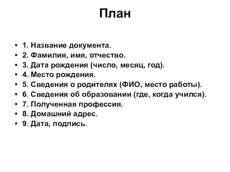 План 1. Название документа.2. Фамилия, имя, отчество.3. Дата рождения (число, месяц, год).4. Место рождения.5. Сведения о родителях