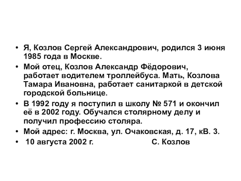 Я, Козлов Сергей Александрович, родился 3 июня 1985 года в Москве. Мой отец, Козлов Александр Фёдорович, работает