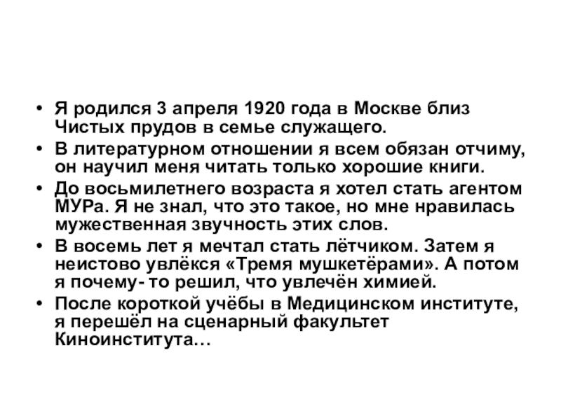 Я родился 3 апреля 1920 года в Москве близ Чистых прудов в семье служащего. В литературном отношении