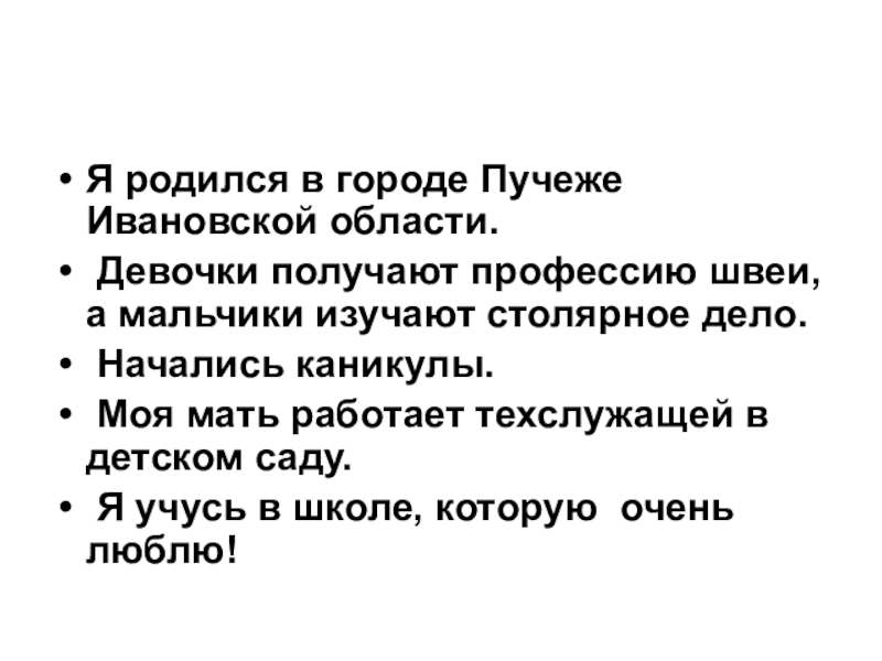 Я родился в городе Пучеже Ивановской области. Девочки получают профессию швеи, а мальчики изучают столярное дело. Начались каникулы. Моя мать работает техслужащей в детском саду. Я учусь в школе, которую очень люблю!