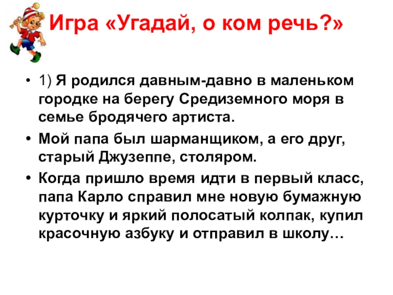 Игра «Угадай, о ком речь?» 1) Я родился давным-давно в маленьком городке на берегу Средиземного моря в