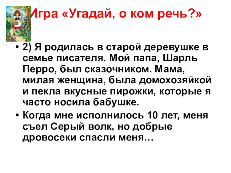 Игра «Угадай, о ком речь?» 2) Я родилась в старой деревушке в семье писателя. Мой папа, Шарль