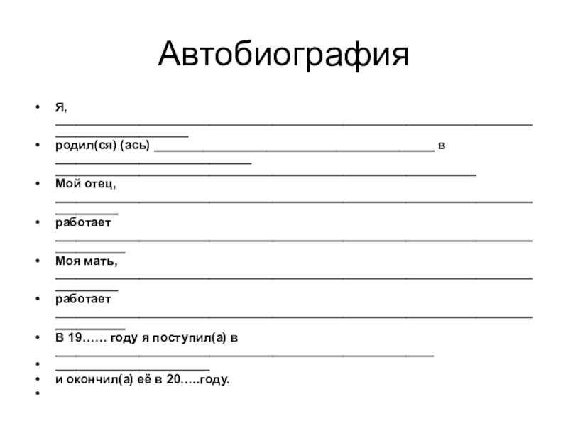 Автобиография Я, _______________________________________________________________________________________родил(ся) (ась) ________________________________________ в ____________________________ ____________________________________________________________Мой отец, _____________________________________________________________________________работает ______________________________________________________________________________Моя мать, _____________________________________________________________________________работает ______________________________________________________________________________В 19…… году я