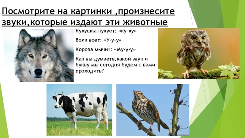 Посмотрите на картинки ,произнесите звуки,которые издают эти животныеКукушка кукует: «ку-ку»Волк воет: «У-у-у»Корова мычит: «Му-у-у»Как вы думаете,какой звук