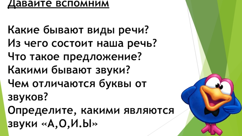 Давайте вспомним Какие бывают виды речи? Из чего состоит наша речь? Что такое предложение? Какими бывают звуки? Чем отличаются буквы от звуков? Определите, какими являются звуки «А,О,И.Ы»