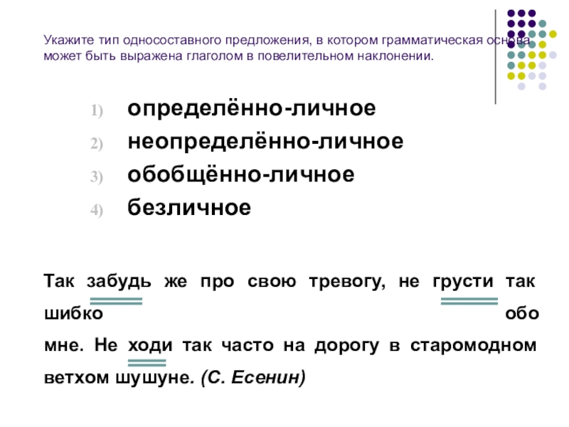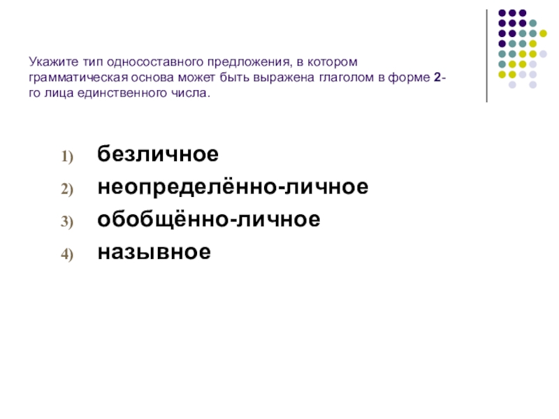 Слайд 63Укажите тип односоставного предложения, в котором грамматическая основа может быть выражена
