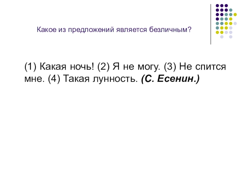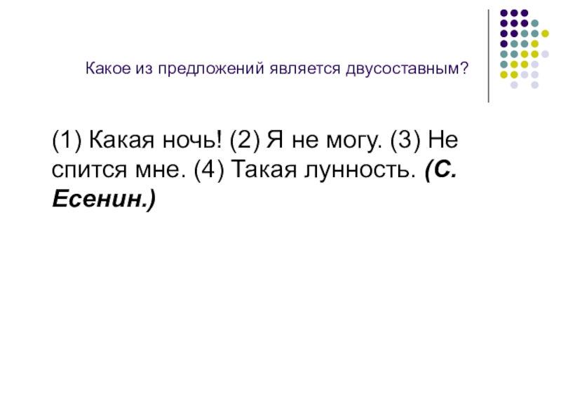 не могу. (3) Не спится мне. (4) Такая лунность. (С. Есенин.)
