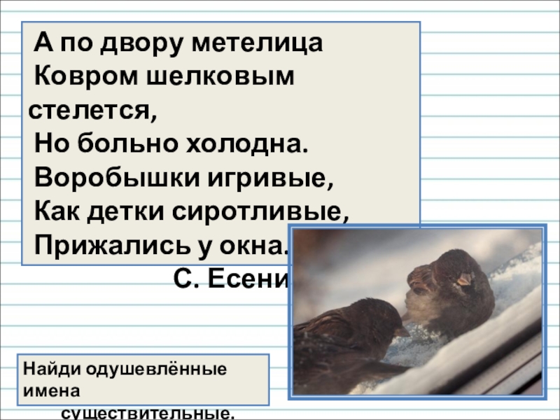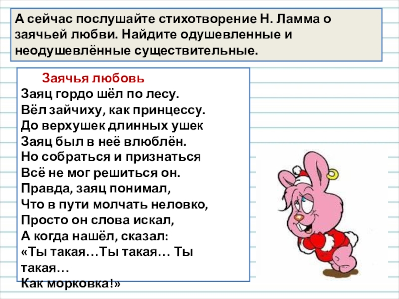 А сейчас послушайте стихотворение Н. Ламма о заячьей любви. Найдите одушевленные и неодушевлённые существительные.