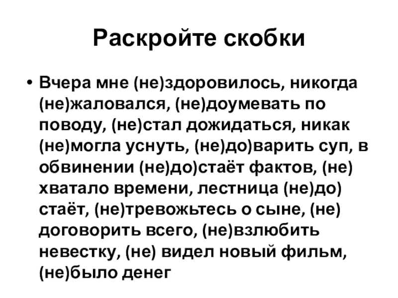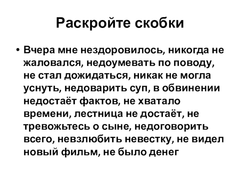 стал дожидаться, никак не могла уснуть, недоварить суп, в обвинении недостаёт фактов, не хватало времени, лестница не достаёт, не тревожьтесь о сыне, недоговорить всего, невзлюбить невестку, не видел новый фильм, не было денег