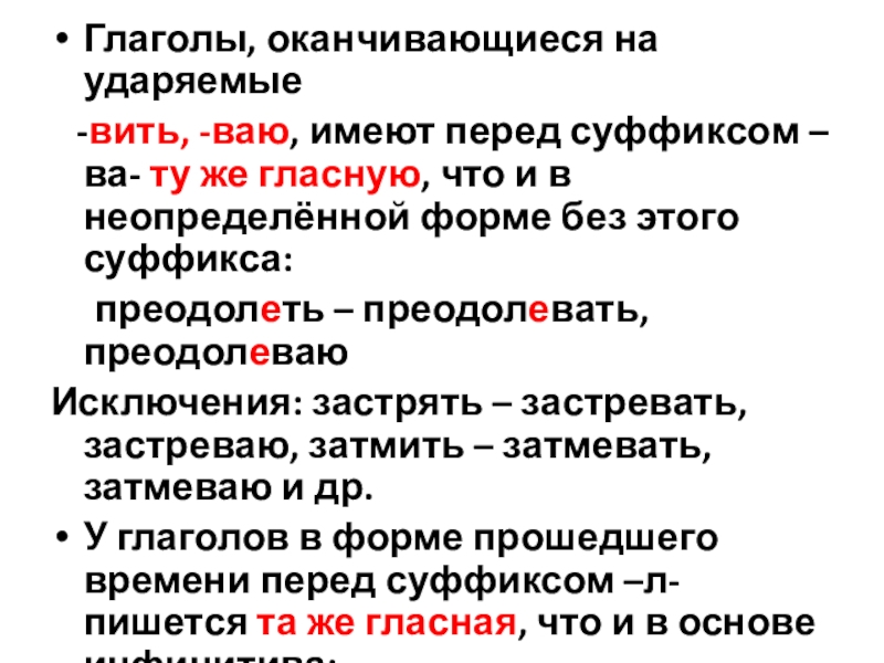 Исключения: застрять – застревать, застреваю, затмить – затмевать, затмеваю и др.