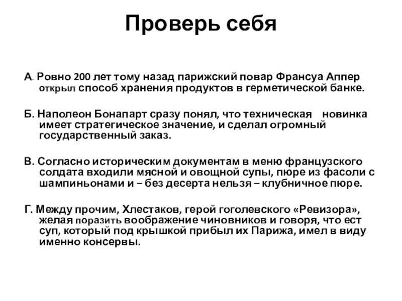 В. Ровно 200 лет назад парижский повар Франсуа Аппер открыл способ хранения продуктов в герметических банках.
