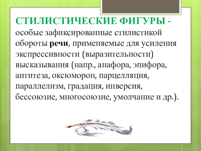 Слайд 5СТИЛИСТИЧЕСКИЕ ФИГУРЫ - особые зафиксированные стилистикой обороты речи, применяемые для усиления экспрессивности (выразительности)