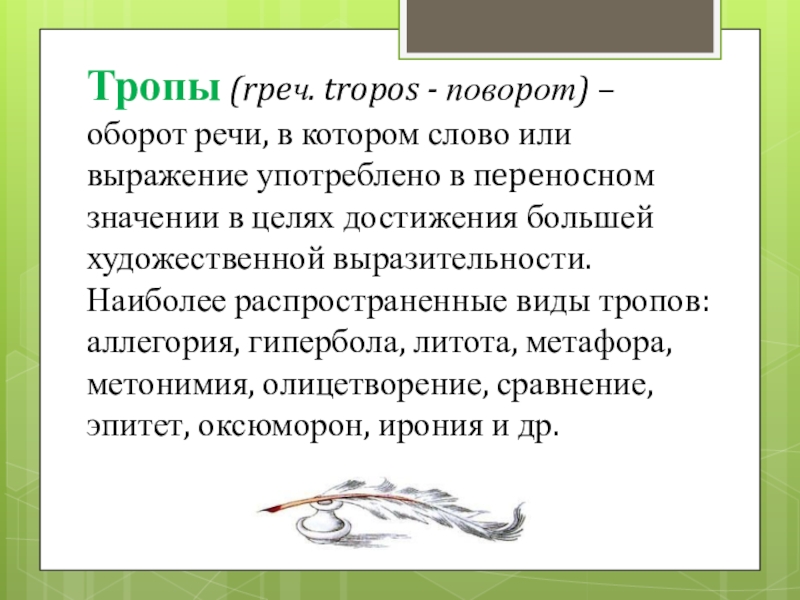 или выражение употреблено в пepeнocнoм значении в целях достижения большей художественной выразительности. Наиболее распространенные виды тропов: аллегория, гипербола, литота, метафора, метонимия, олицетворение, сравнение, эпитет, оксюморон, ирония и др.