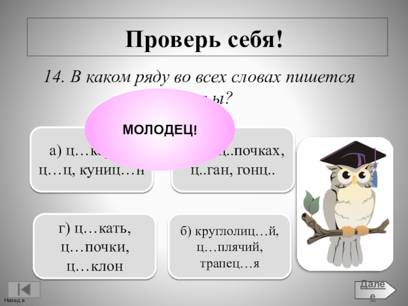 г) ц...кнуть, рукавиц..., удальц...