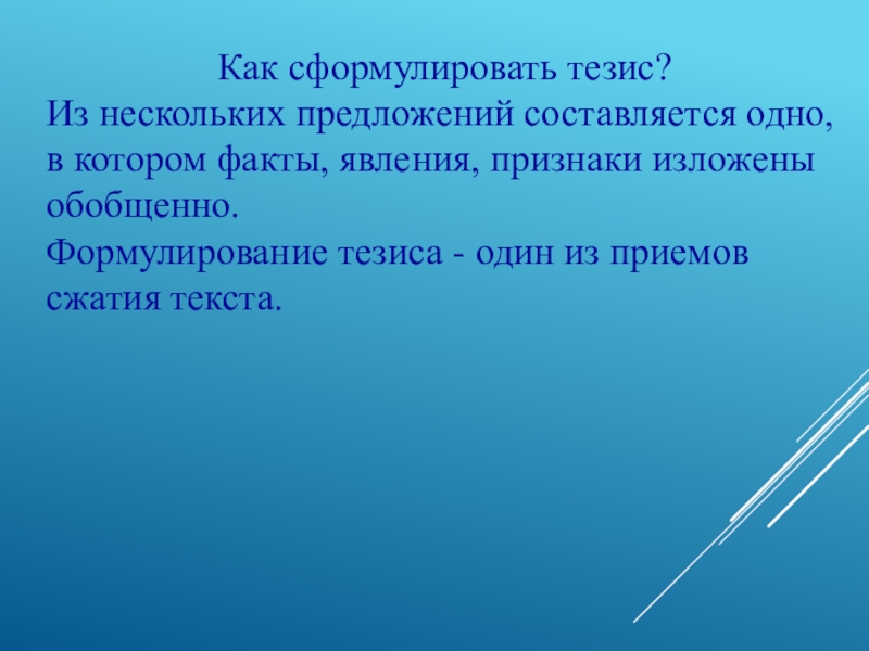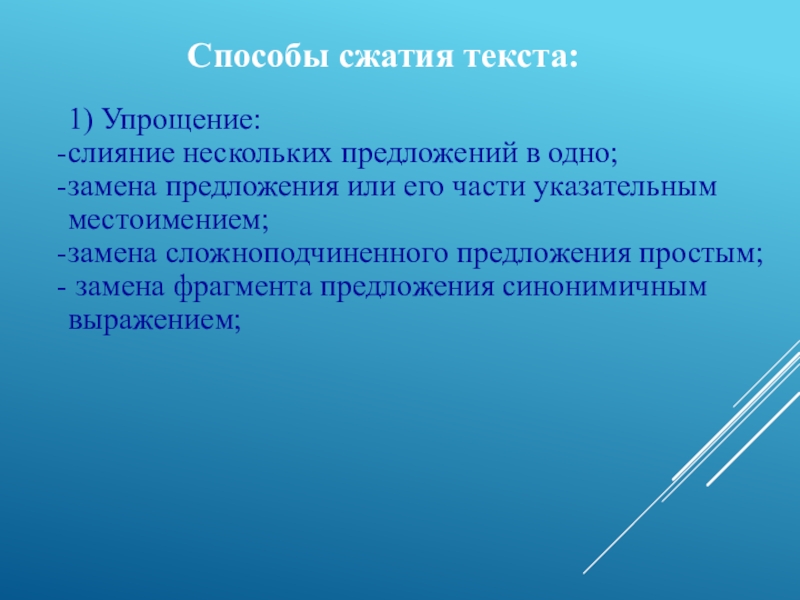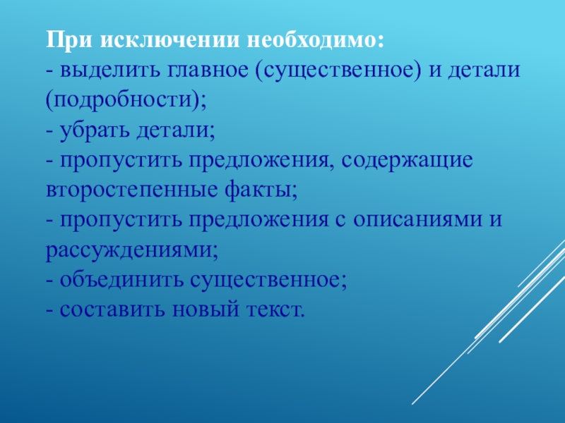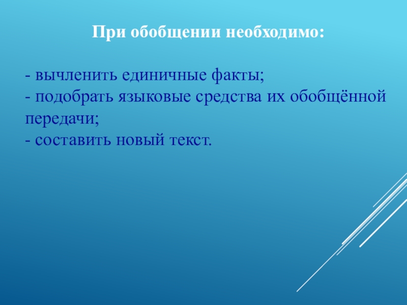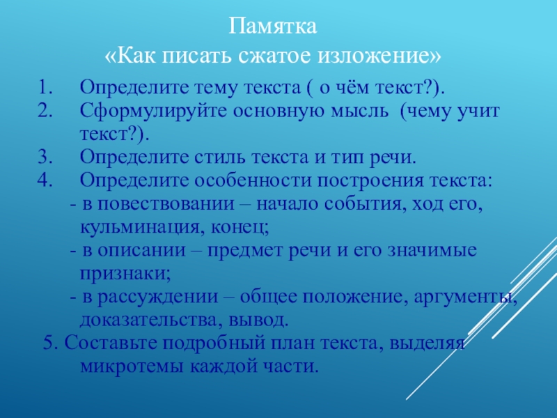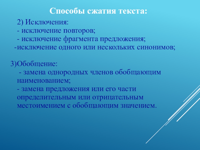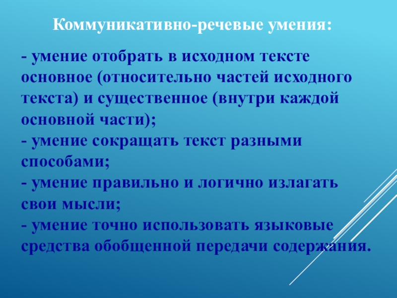 передать содержимое текста, отобрать существенную информацию, исключить подробности, найти речевые средства обобщения.