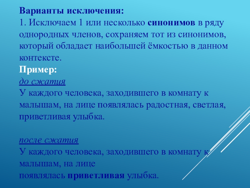 1. Исключаем 1 или несколько синонимов в ряду однородных членов, сохраняем тот