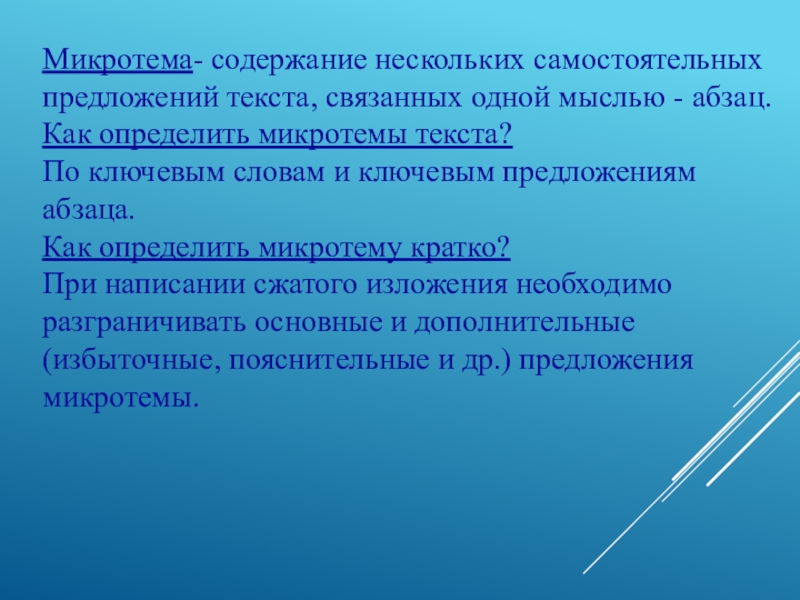 Слайд 10Микротема- содержание нескольких самостоятельных предложений текста, связанных одной мыслью - абзац.