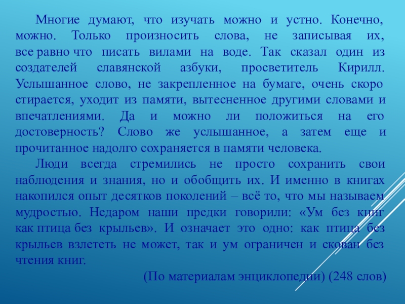 Многие думают, что изучать можно и устно. Конечно, можно. Только произносить слова, не записывая их, все равно что писать вилами на воде. Так сказал один из создателей славянской азбуки, просветитель Кирилл. Услышанное слово, не закрепленное на бумаге, очень скоро стирается, уходит из памяти, вытесненное другими словами и впечатлениями. Да и можно ли положиться на его достоверность? Слово же услышанное, а затем еще и прочитанное надолго сохраняется в памяти человека.
