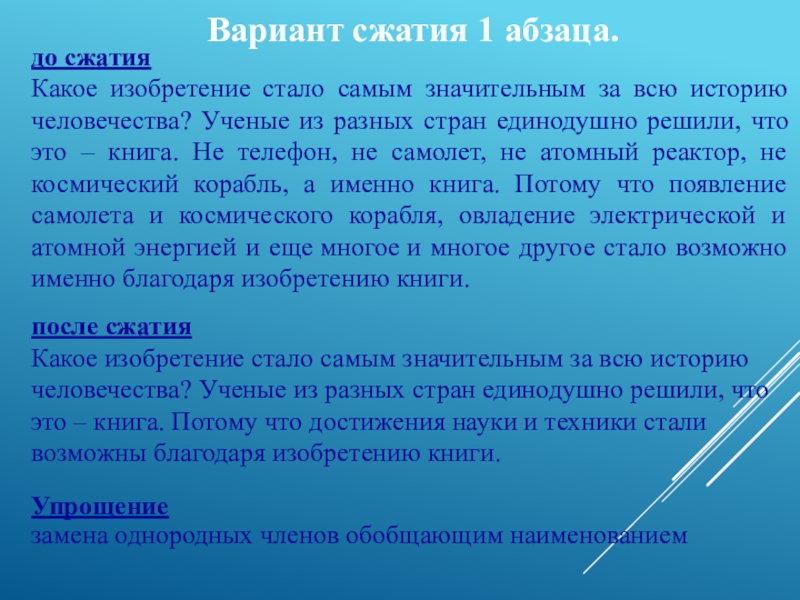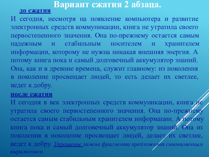 И сегодня в век электронных средств коммуникации, книга не утратила своего первостепенного значения. Она по-прежнему остается самым стабильным хранителем информации. А потому книга пока и самый долговечный аккумулятор знаний. Она из поколения в поколение просвещает людей, делает их светлее, ведет к добру. Упрощение замена фрагмента предложения синонимичным выражением