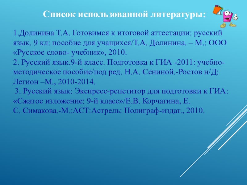 3. Русский язык: Экспресс-репетитор для подготовки к ГИА: «Сжатое изложение: 9-й класс»/Е.В. Корчагина, Е.С. Симакова.-М.:АСТ:Астрель: Полиграф-издат., 2010.