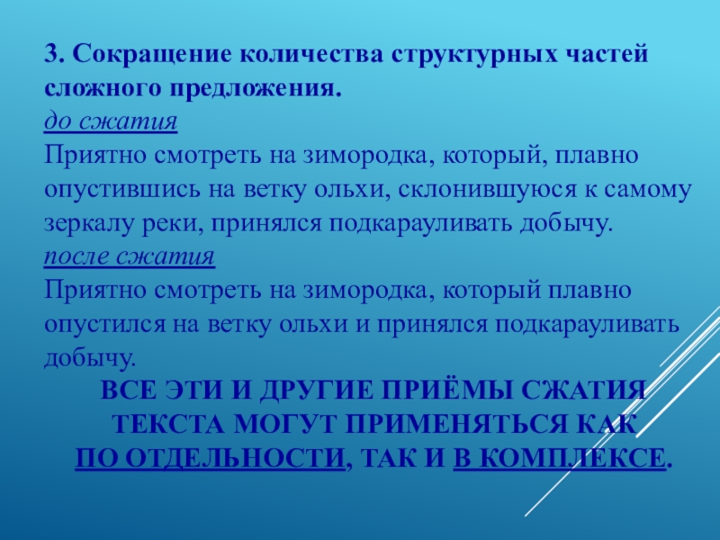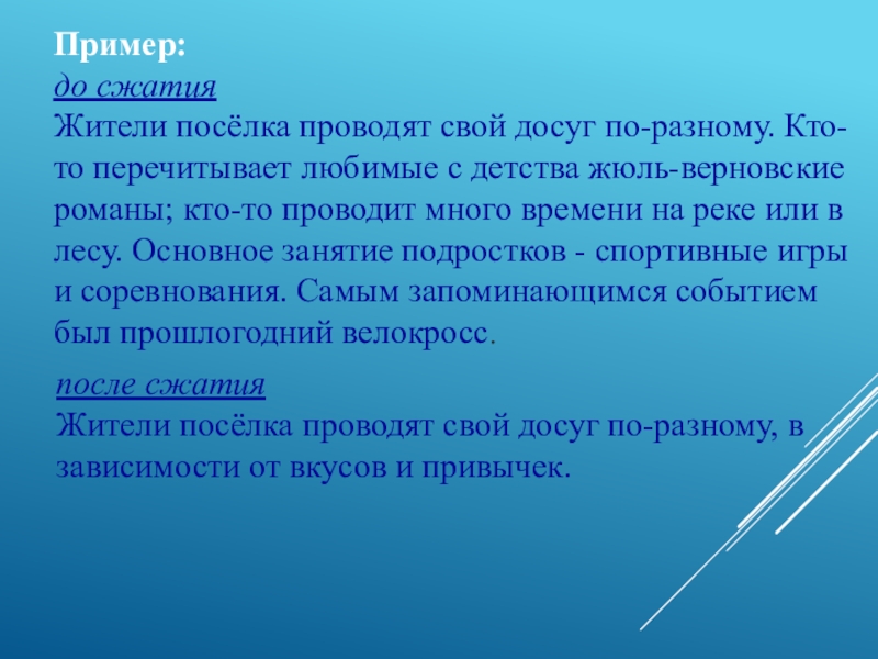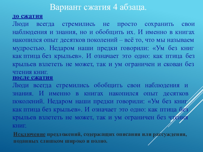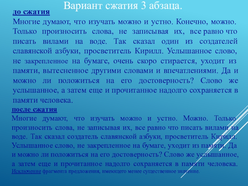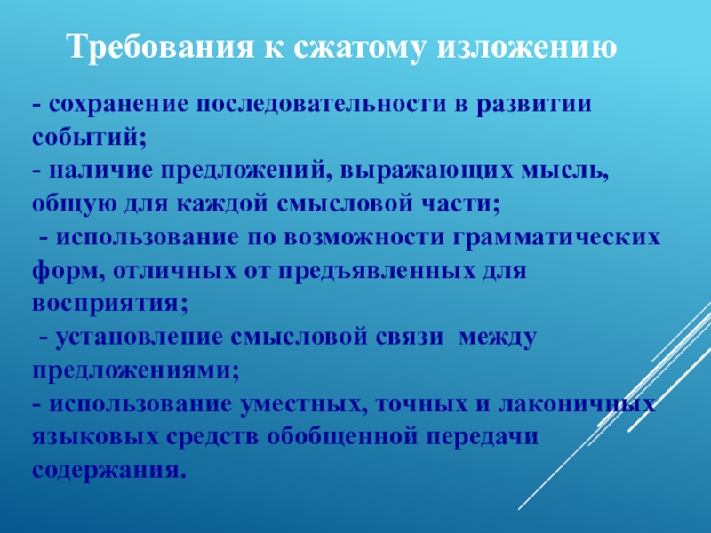 При сжатом изложении не обязательно сохранение стилевых особенностей авторского текста, но основная мысль автора, логическая последовательность событий, характер действующих лиц и обстановка должны быть переданы без искажения.
