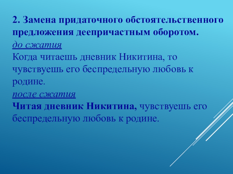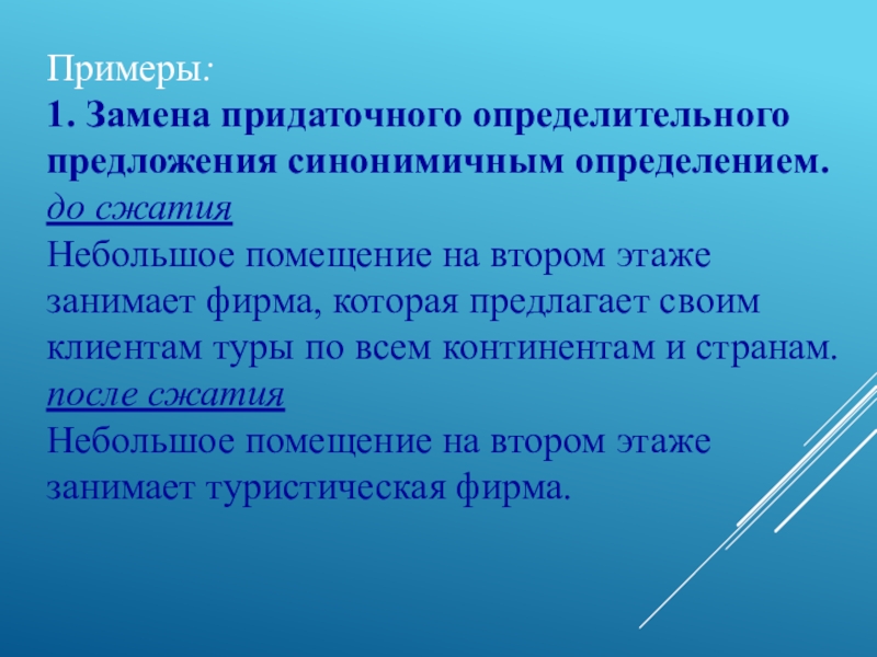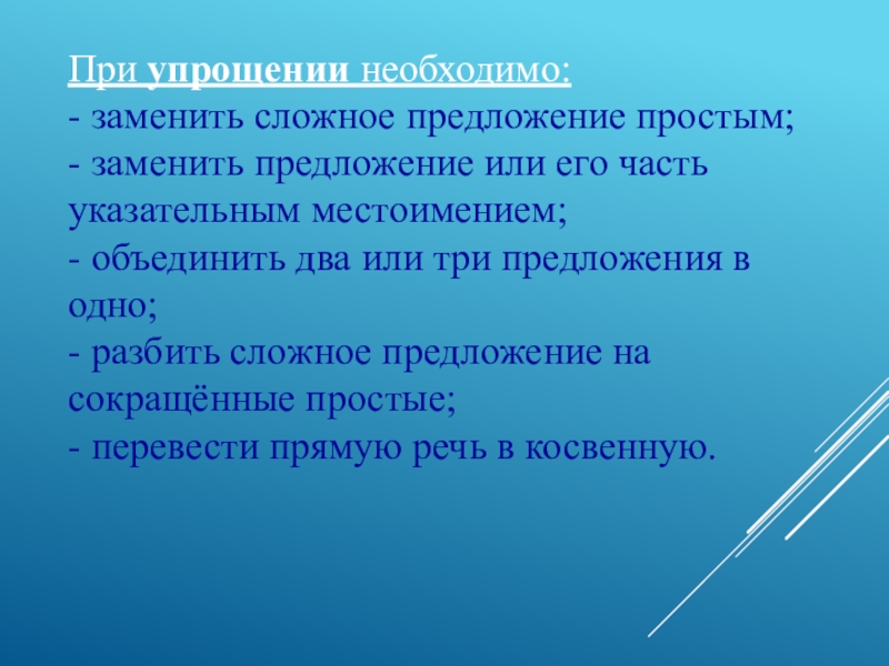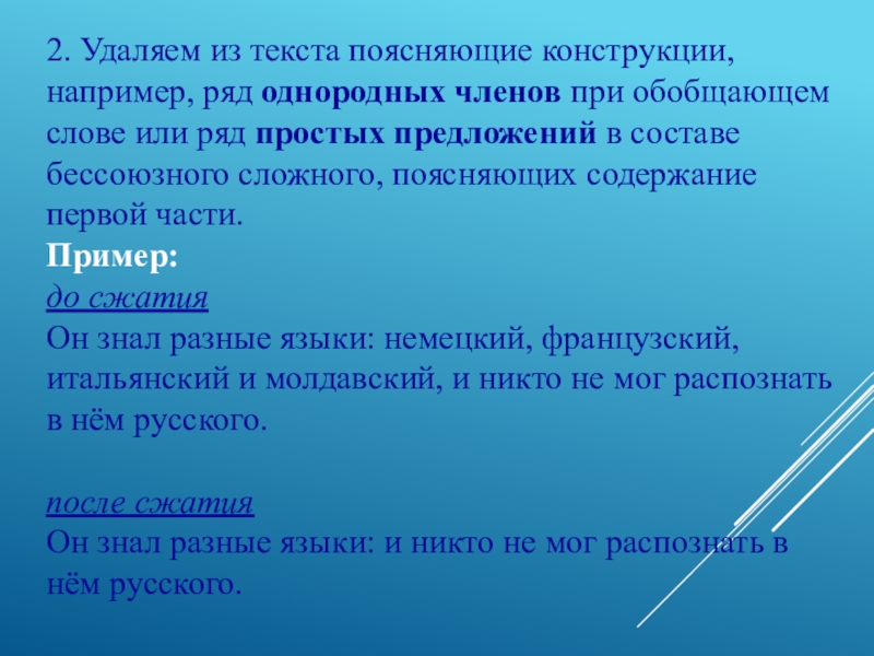 Слайд 212. Удаляем из текста поясняющие конструкции, например, ряд однородных членов при обобщающем слове