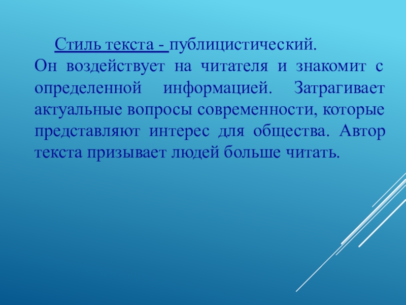 определенной информацией. Затрагивает актуальные вопросы современности, которые представляют интерес для общества. Автор текста призывает людей больше читать.