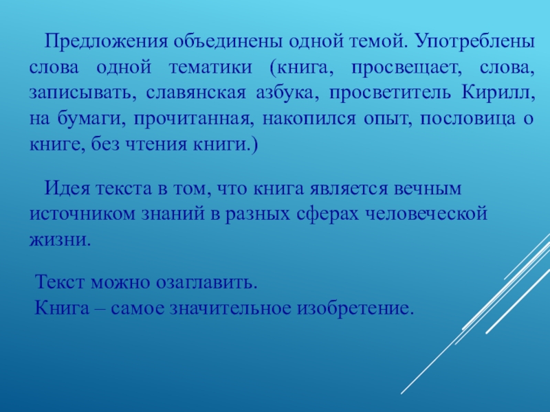 Слайд 26 Предложения объединены одной темой. Употреблены слова одной тематики (книга, просвещает,