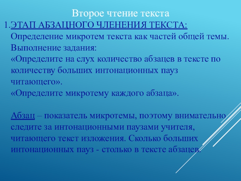 Абзац – показатель микротемы, поэтому внимательно следите за интонационными паузами учителя, читающего текст изложения. Сколько больших интонационных пауз - столько в тексте абзацев.