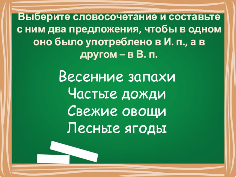 Весенние запахиЧастые дождиСвежие овощиЛесные ягодыВыберите словосочетание и составьте с ним два предложения, чтобы в одном оно было