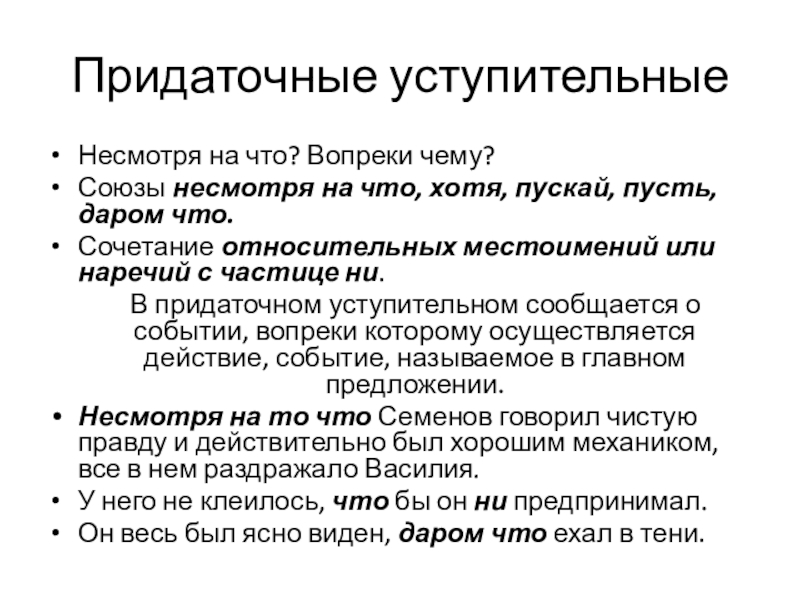 В придаточном уступительном сообщается о событии, вопреки которому осуществляется действие, событие, называемое в главном предложении.