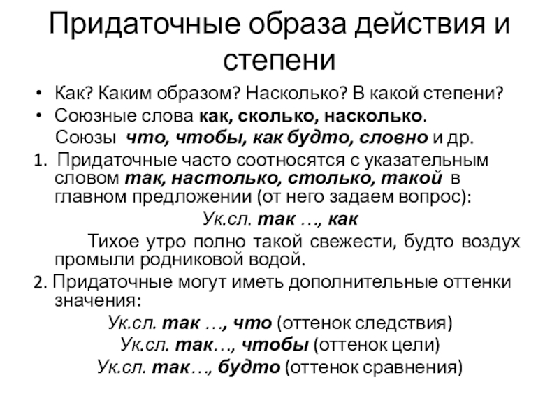 1. Придаточные часто соотносятся с указательным словом так, настолько, столько, такой в главном предложении (от него задаем вопрос):