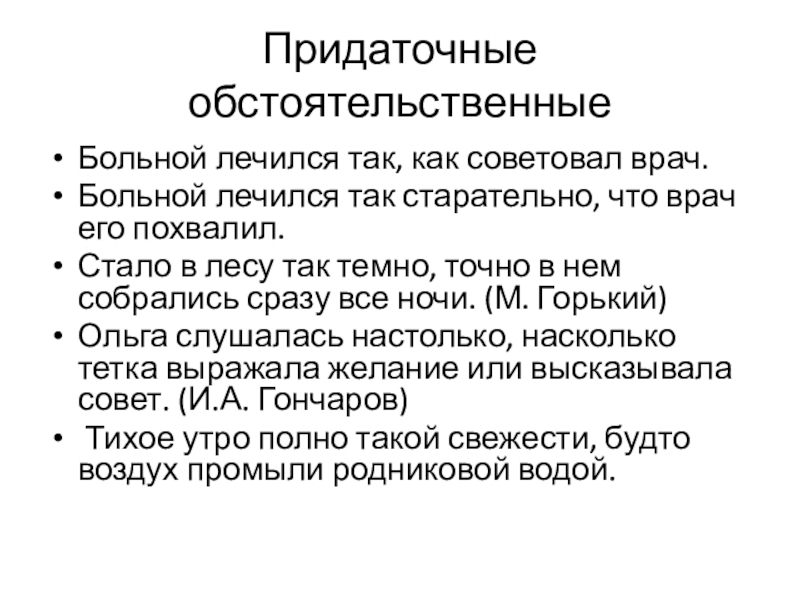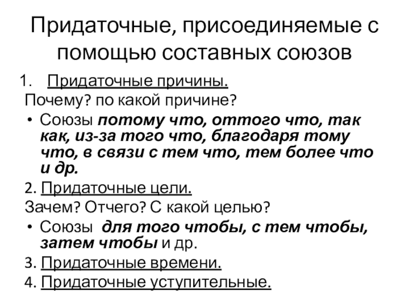 что, оттого что, так как, из-за того что, благодаря тому что, в связи с тем что, тем более что и др.