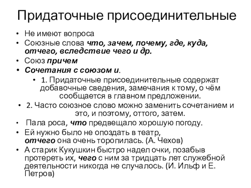 1. Придаточные присоединительные содержат добавочные сведения, замечания к тому, о чём сообщается в главном предложении.