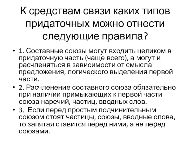 Слайд 11К средствам связи каких типов придаточных можно отнести следующие правила?