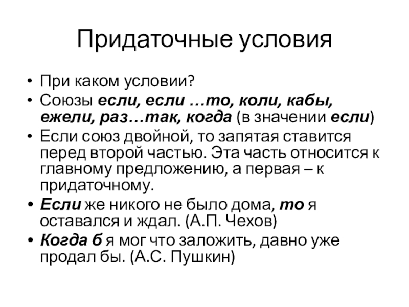 Союзы если, если …то, коли, кабы, ежели, раз…так,