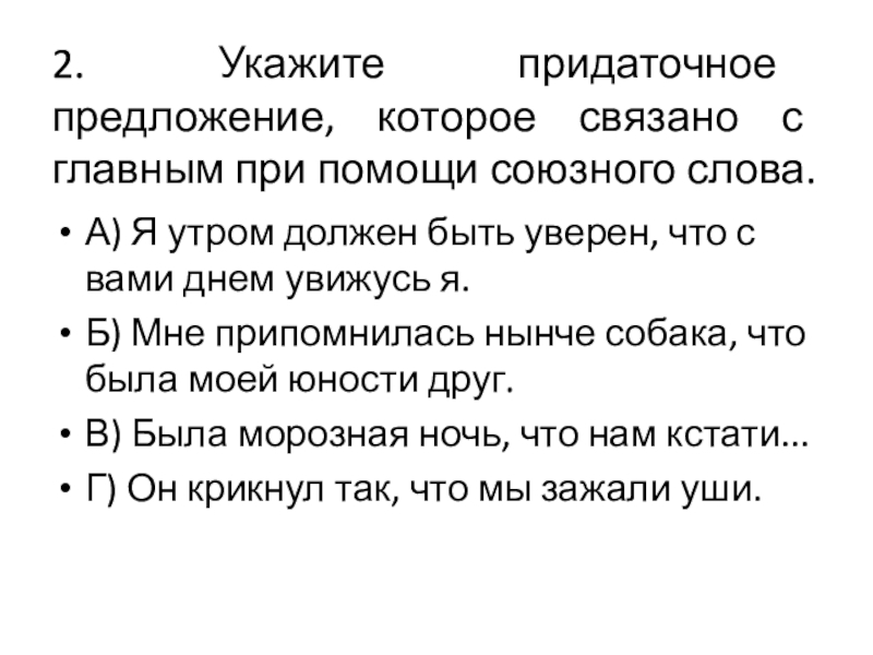 Слайд 192. Укажите придаточное предложение, которое связано с главным при помощи союзного