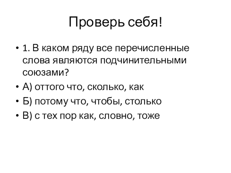 1. В каком ряду все перечисленные слова являются подчинительными союзами?