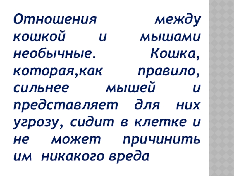 Слайд 8Отношения между кошкой и мышами необычные. Кошка, которая,как правило, сильнее мышей