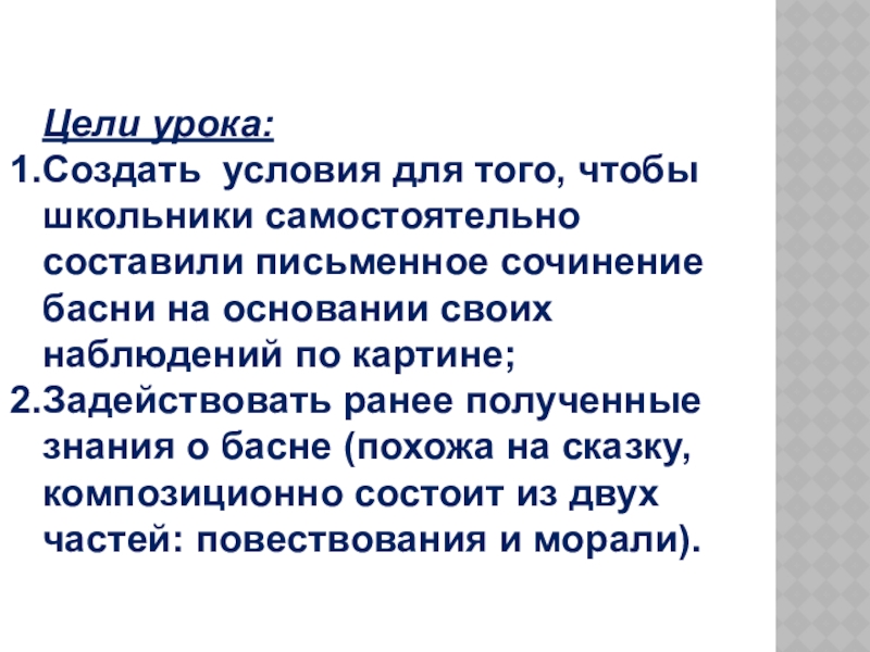 Задействовать ранее полученные знания о басне (похожа на сказку, композиционно состоит из двух частей: повествования и морали).
