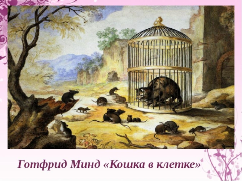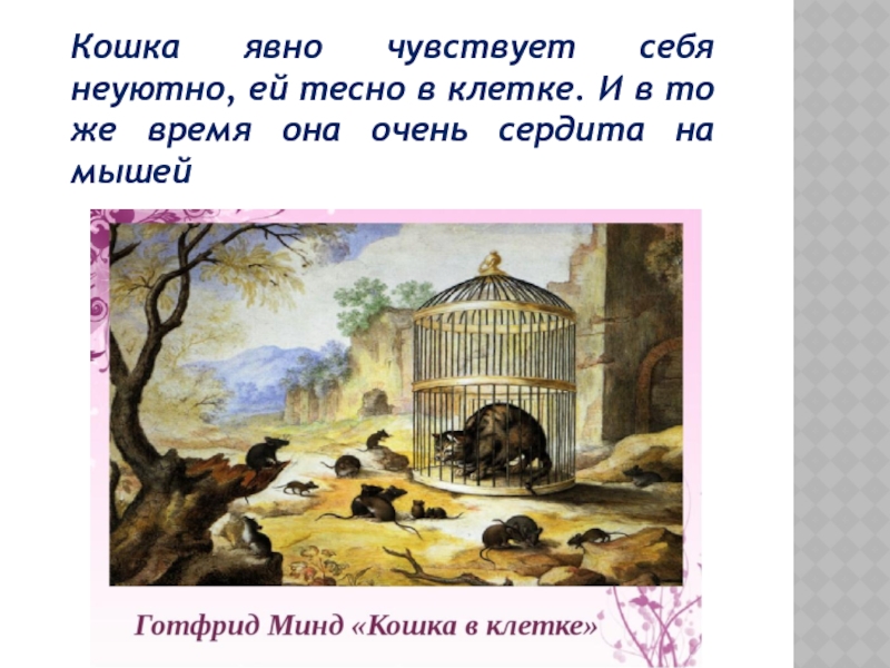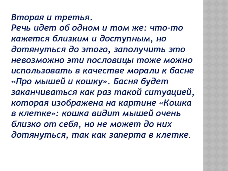 кажется близким и доступным, но дотянуться до этого, заполучить это невозможно эти пословицы тоже можно использовать в качестве морали к басне «Про мышей и кошку». Басня будет заканчиваться как раз такой ситуацией, которая изображена на картине «Кошка в клетке»: кошка видит мышей очень близко от себя, но не может до них дотянуться, так как заперта в клетке.