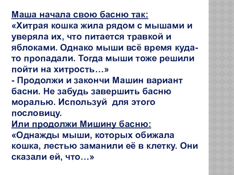 - Продолжи и закончи Машин вариант басни. Не забудь завершить басню моралью. Используй для этого пословицу.