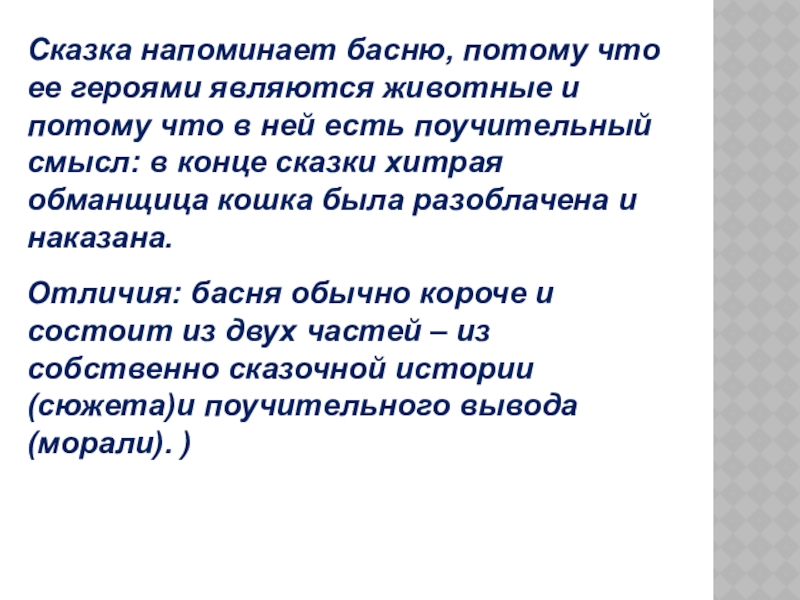 Слайд 12Сказка напоминает басню, потому что ее героями являются животные и потому