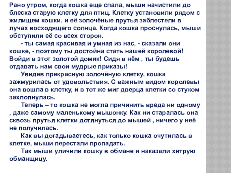 «Однажды мыши, которых обижала кошка, лестью заманили её в клетку. Они сказали ей, что…»