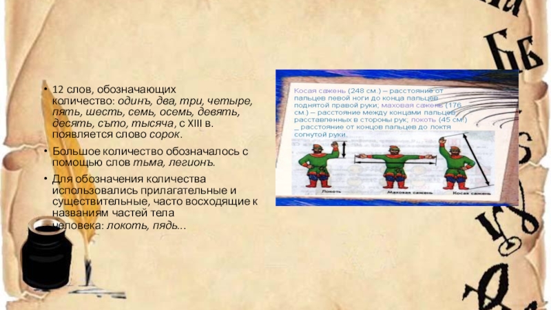 Для обозначения количества использовались прилагательные и существительные, часто восходящие к названиям частей тела человека: локоть, пядь...
